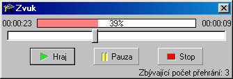 Délka zvuku - časový údaj při levém okraji okna říká, jaká je celková délka tohoto zvuku. Procenta - tento procentuelní ukazatel ukazuje, na kolik procent je již tento zvuk přehrán. Pozice přehrávání - časový údaj při pravém okraji okna říká, jak veliká část tohoto zvuku je již přehrána. Posuvník - pomocí tohoto posuvníku, můžete zvuk libovolně přetáčet jak dopředu, tak i dozadu, není-li to autorem testu zakázáno. Hraj - spustí přehrávání zvuku z jeho aktuální pozice. Pauza - pozastaví přehrávání zvuku na současné pozici. Stop - zastaví přehrávání zvuku a vrátí se na začátek. Zbývající počet přehrání - pokud autor testu zadal tomuto zvuku omezený počet přehrání, pak je v pravém dolním rohu okna uvedeno, kolikrát ještě si můžete zvuk přehrát. U některách testů mohou být autorem testu některé funkce zakázány. |